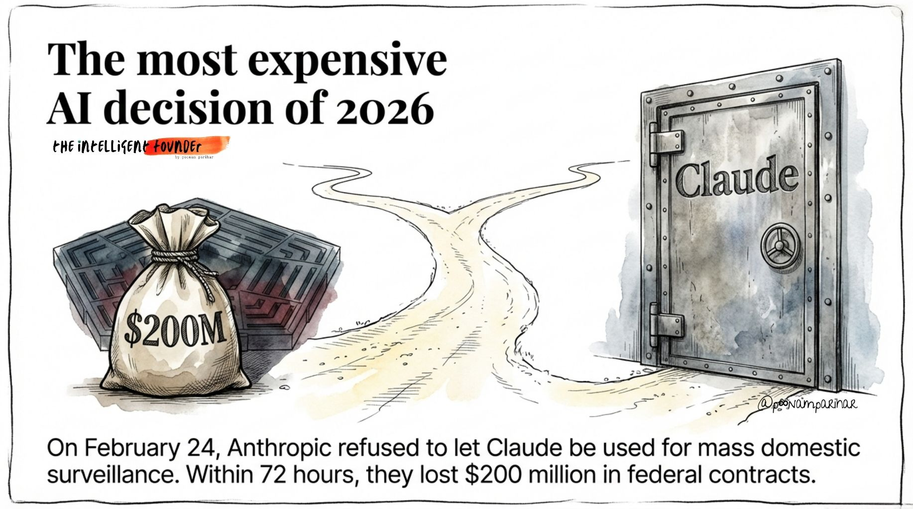 On February 24, 2026, Anthropic CEO Dario Amodei published a statement saying his company would not let Claude be used for mass domestic surveillance or fully autonomous weapons, even if it meant losing the Pentagon. Three days later, Trump banned Anthropic from every federal system, designated it a national security supply-chain risk, and OpenAI signed a deal to replace them. In 72 hours, Anthropic lost roughly $200 million in federal contracts and its entire government channel. It was the most expensive “where do we draw the line on AI?” decision any founder has made this year.