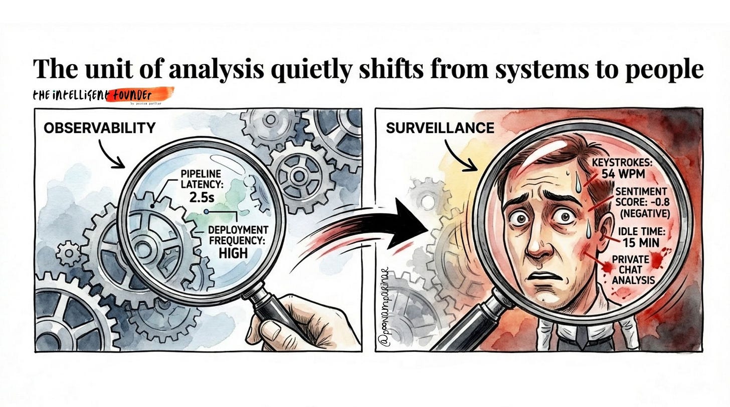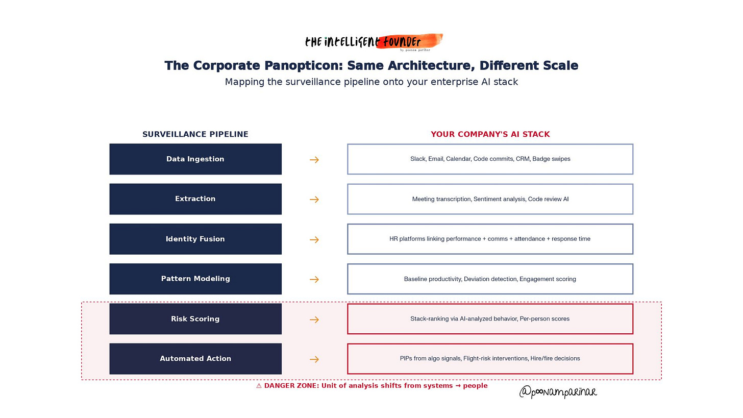 But the aggregate of the Slack analytics plus calendar scoring plus code-commit tracking plus meeting sentiment analysis plus flight-risk modeling, is a your corporate Panopticon. The unit of analysis has quietly shifted from systems to people. and what happens next is very clear.