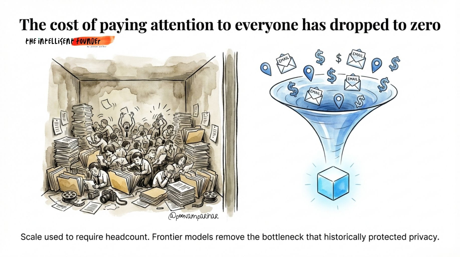 Before LLMs, mass surveillance required massive human analyst teams. With LLMs, you can generate comprehensive behavioral profiles for every person in a city, continuously, automatically. The constraint that used to protect liberty, the cost of attention as we said earlier and now repeat , well… » disappears.