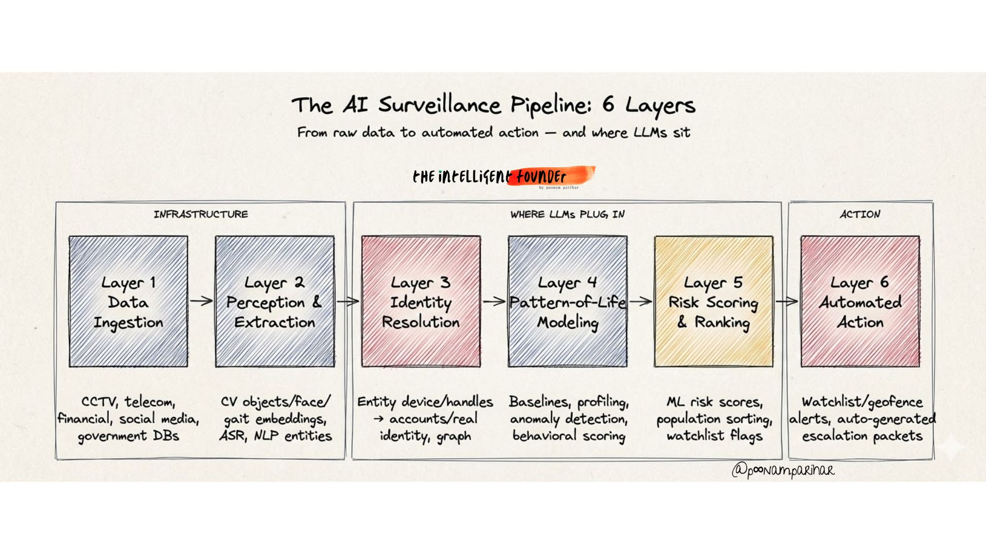 The Pipeline —> The 6-layer architecture behind AI mass surveillance, from raw data ingestion to automated action, and where LLMs actually sit